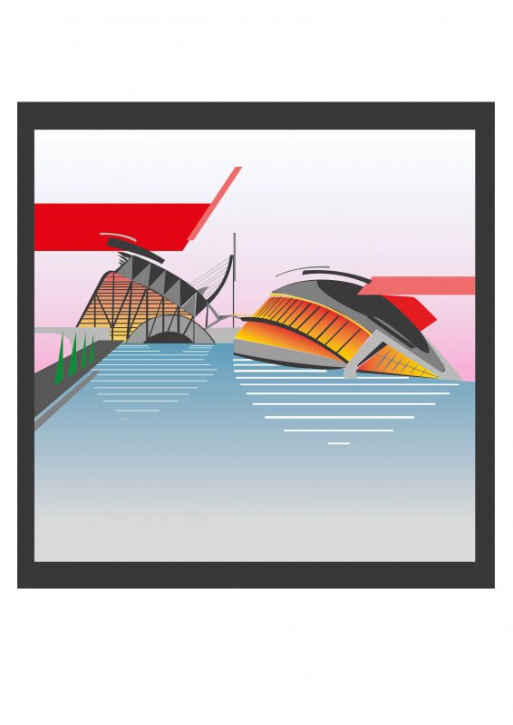 Ilustración de una vista de la Ciudad de las Artes y las Ciencias de Valencia.
